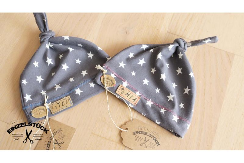Ein echtes Einzelstück, wie ihr neuer Erdenbürger. Meine süßen Knotenmützchen sind aus hochwertigem Baumwoll-Jersey (95% Baumwolle, 5% Elastan) genäht. Ein echter Hinkucker sind die aufgenähten Namensaufnäher. Die Mützchen überstehen problemlos sehr viele Wäschen und sind trocknergeeignet. Mehrfach erprobt durch viele Babys.
