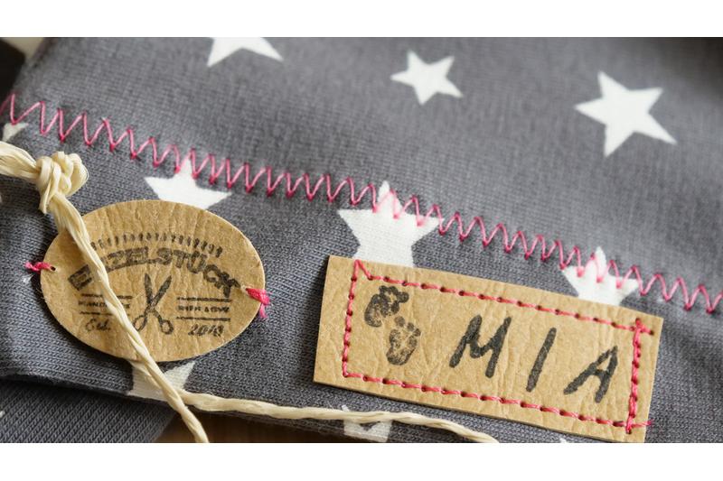 Das Mützchen wird mit dem Namen ihres Babys personalisiert. Der Namenspatch ist aus SnapPap (veganes Leder)und nach dem Waschen weich wie echtes Leder.